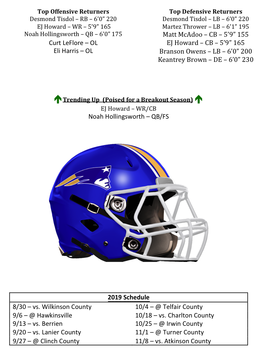 All Region quarterback Noah Hollingsworth returns for the Patriots. Desmond Tisdol returns at running back, while EJ Howard returns at wide receiver. The offensive line will be anchored by Eli Harris and Curt LeFlore.