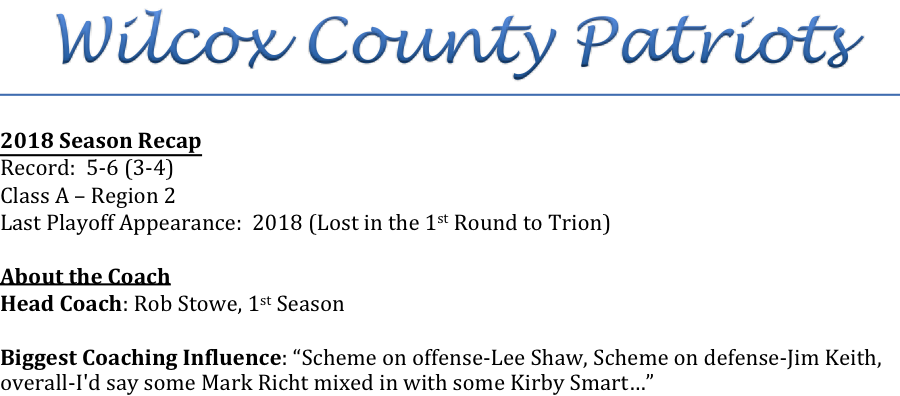 Rob Stowe takes over as the head coach for the Wilcox County Patriots. Stowe was served as head coach at Gilmer between 2003 and 2006. We asked Coach Stowe what his team’s biggest challenge was coming into this season.