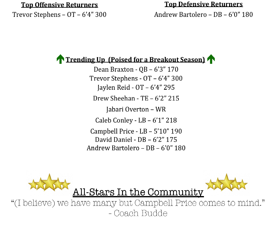 On defense there will also be plenty of opportunities for a new crop of Wolverines to make their mark. Defensive back, Andrew Bartolero, a Second Team All-Reigion selection does return for his junior season. Bartolero was third on the team in tackles last season. He will be joined in the secondary by David Daniel. Line backers Caleb Conley and Campbell Price are projected as players that could make an impact on the Wolverine defense.